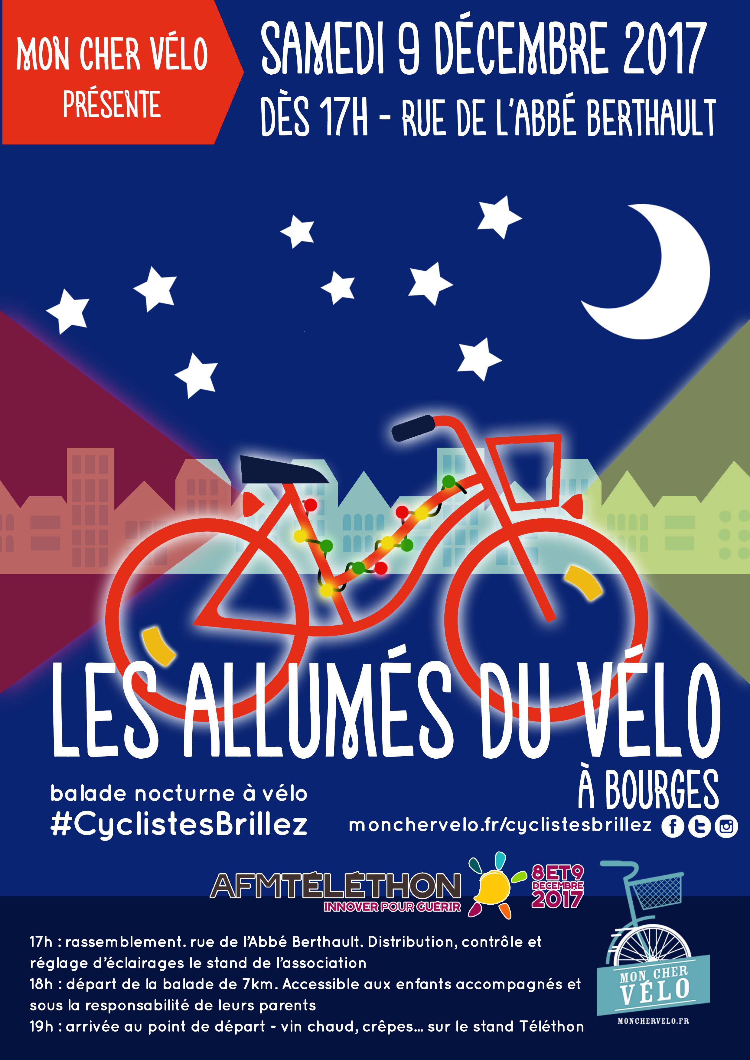 Mon Cher Vélo en partenariat avec la préfecture du Cher, participe à cette campagne en allant à la rencontre des cyclistes pour les informer sur l’éclairage de leur bicyclette. Tout au long de l’hiver, les bénévoles de l’association seront sur le terrain pour distribuer des brassards réfléchissant et renseigner les cyclistes sur la nécessité d’être visible à vélo. Prochain rendez vous :