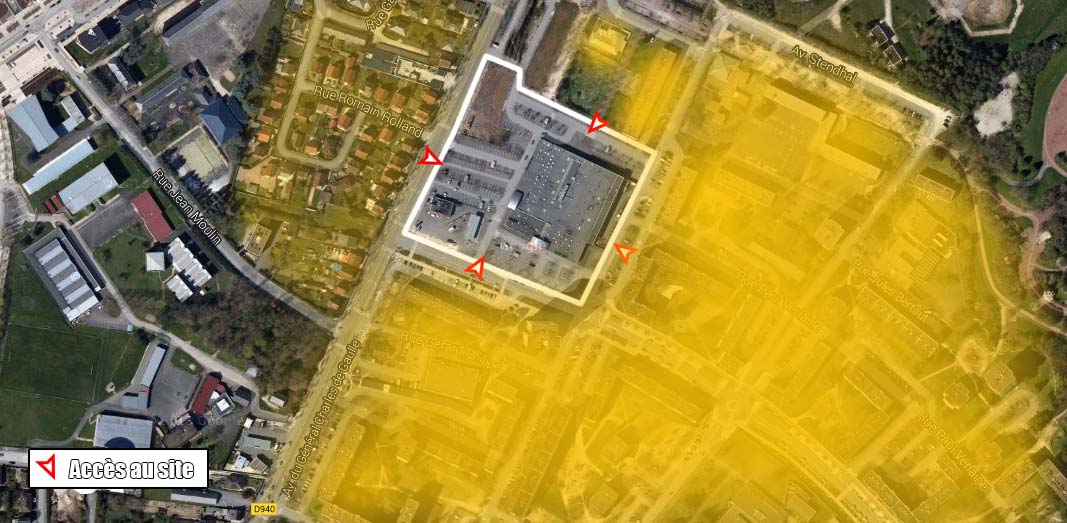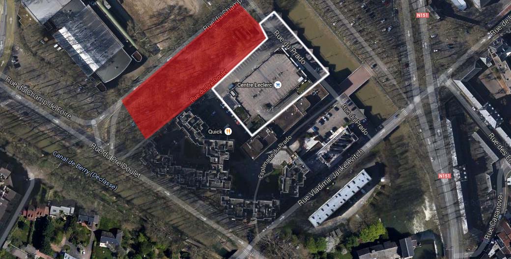 Vue aérienne du Leclerc Prado (bordures blanches) et de la gare routière (en rouge)