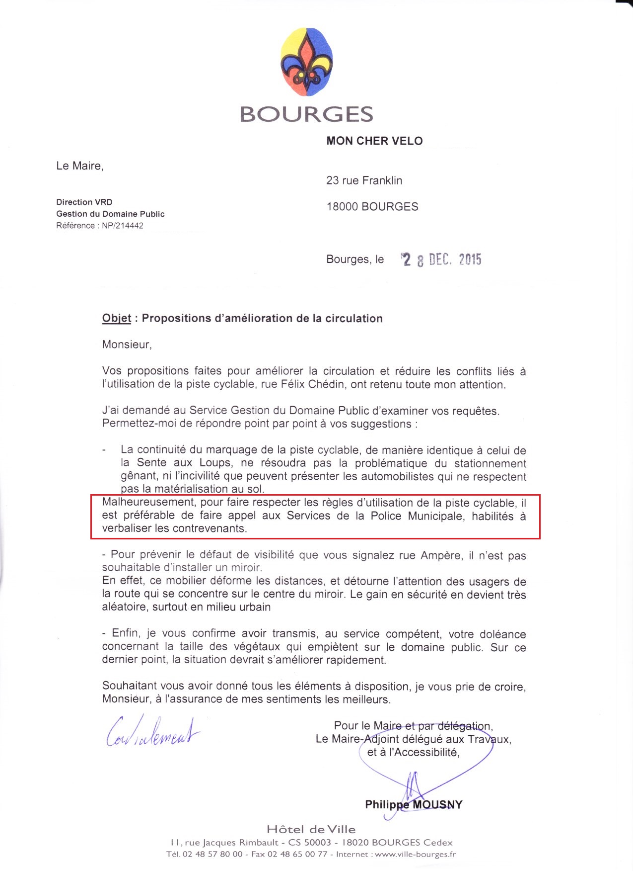 Pour finir, précisons que la ville de Bourges elle même nous incite à faire appel aux services de police là où nous sollicitons de leur part du marquage au sol pour prévenir le stationnement sauvage. Donc acte.