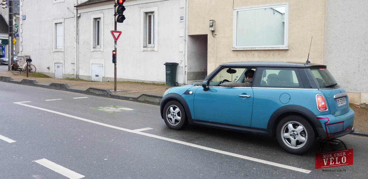 • de se placer devant la file de voiture qui attend le feut vert de manière à être visible plutôt que d’être remisé dans leur angle mort, le long du caniveau situé à droite des véhicules (et accessoirement de respirer moins de gaz d’échappement…)