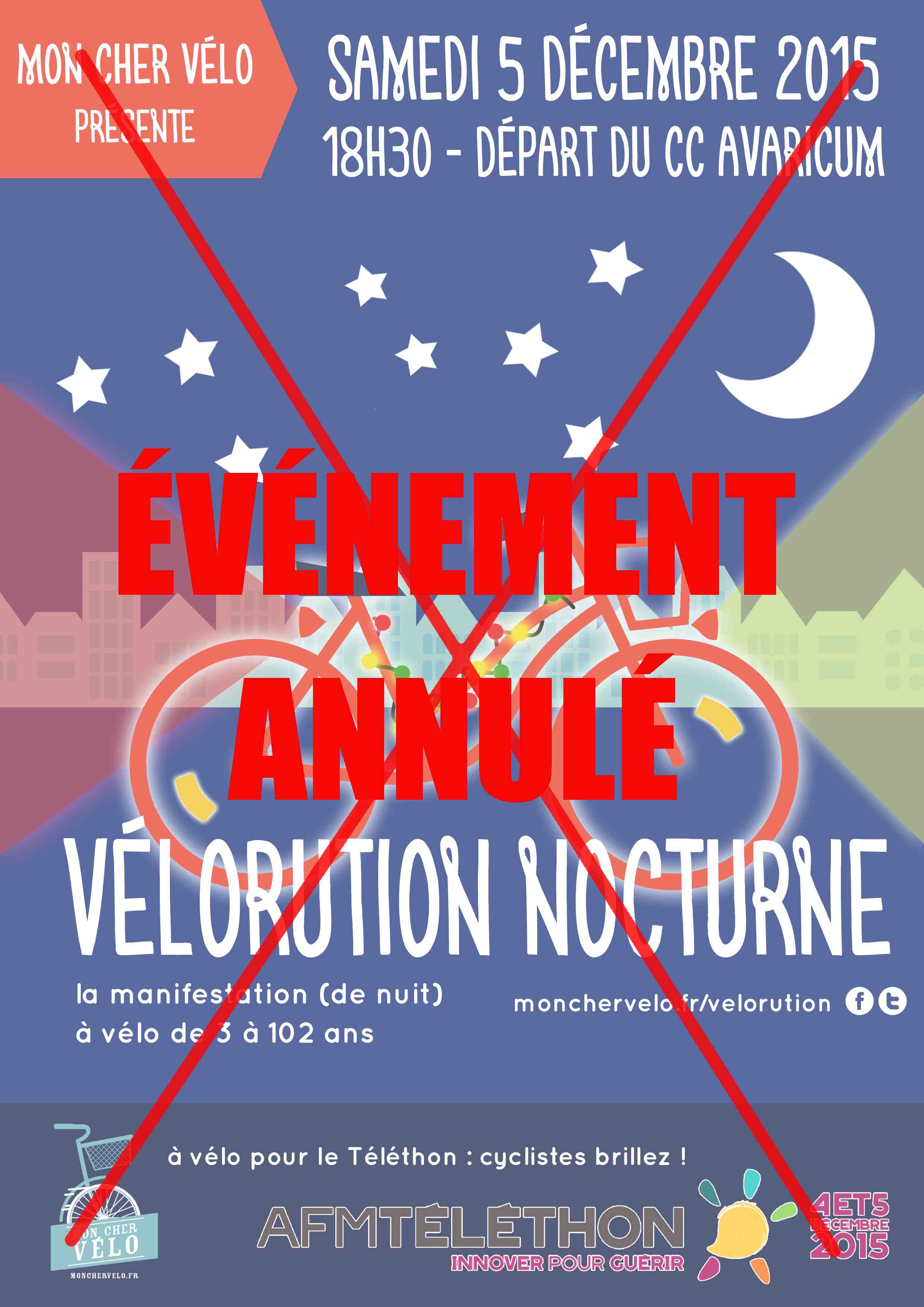 Aussi, nous nous sommes réunis ce soir et avons pris la décision d’annuler la Vélorution nocturne prévue ce samedi 5 décembre 2015 pour la reporter au samedi 27 février 2016.